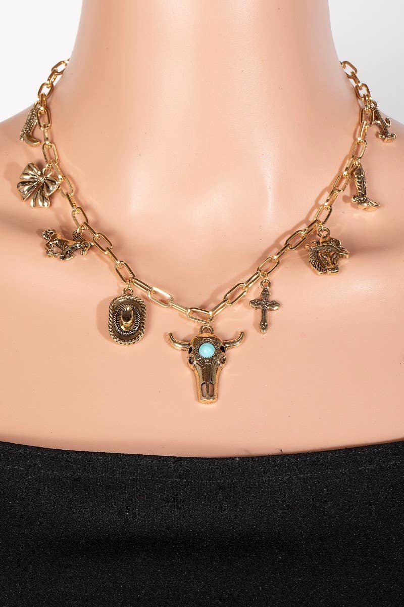 This piece is perfect for those who want to showcase their unique style, this necklace introduces an exceptional assorted western bull charm design. Elevate your outfit with this stylish necklace that's perfect for any occasion. This necklace approximately measures: Length: 16 Inches Extension: 3 Inches This necklace is made with 30% Steel, 30% Zinc, 20% Recon and 20% Resin.