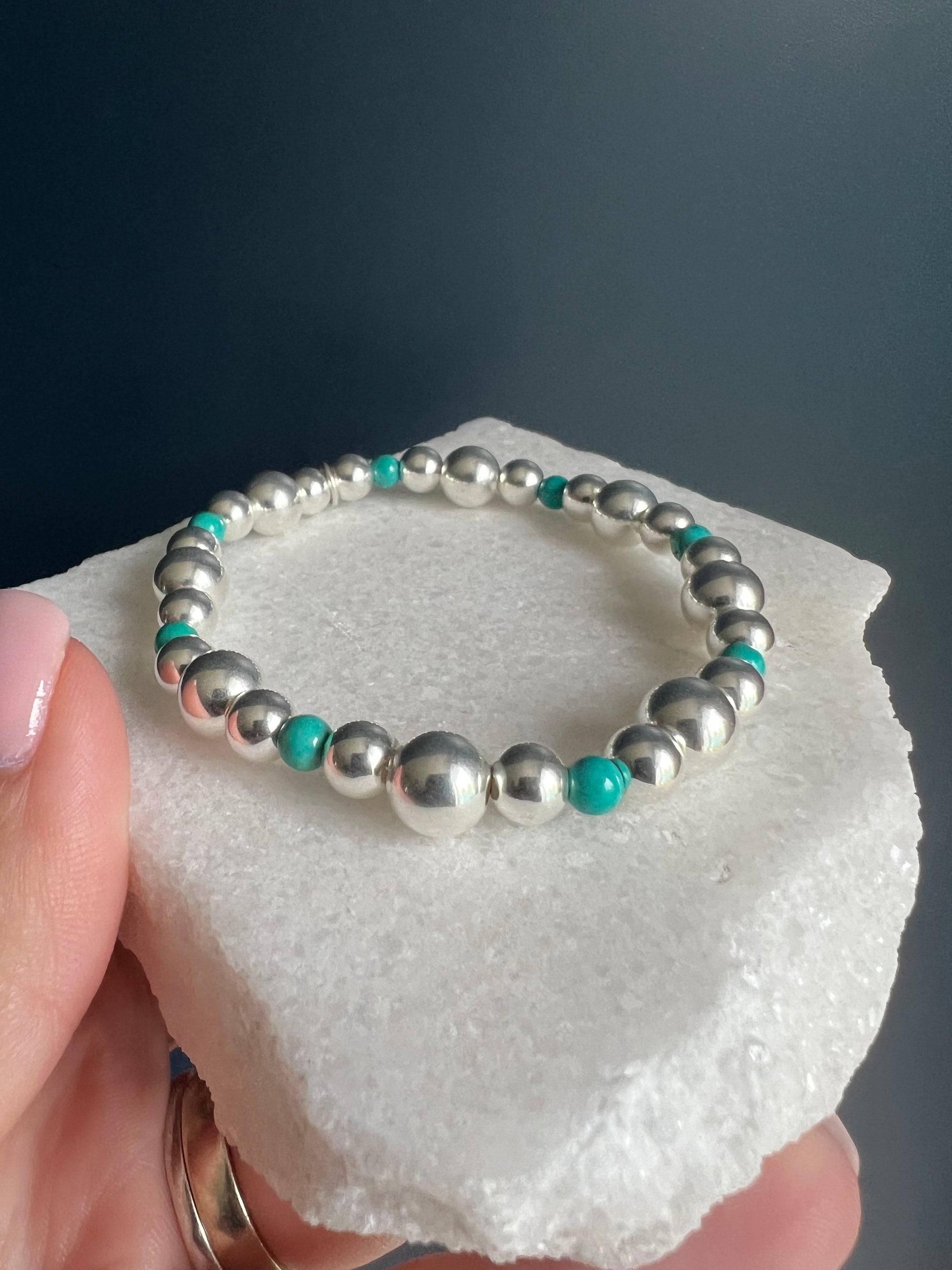 925 sterling silver, turquoise, elastic.