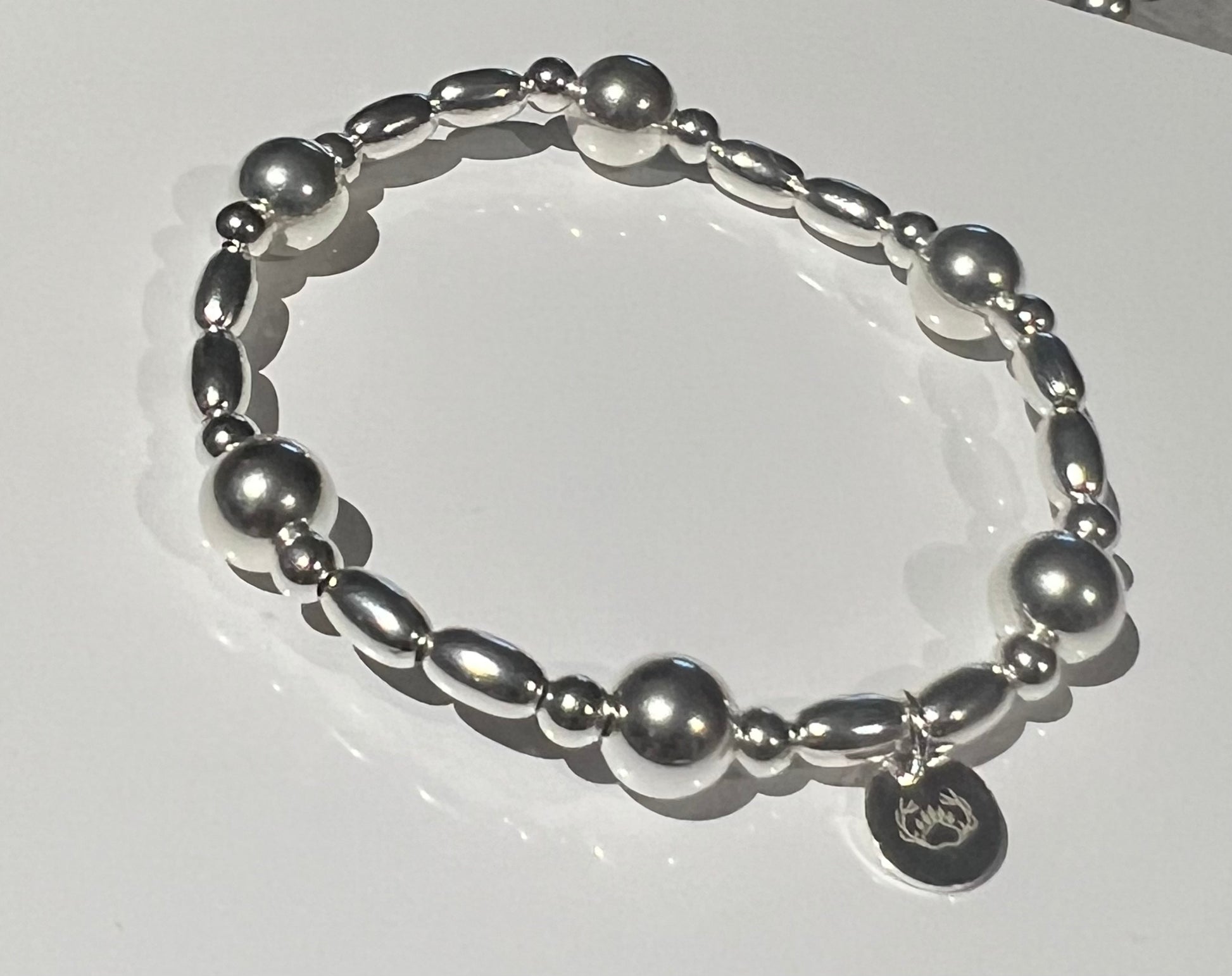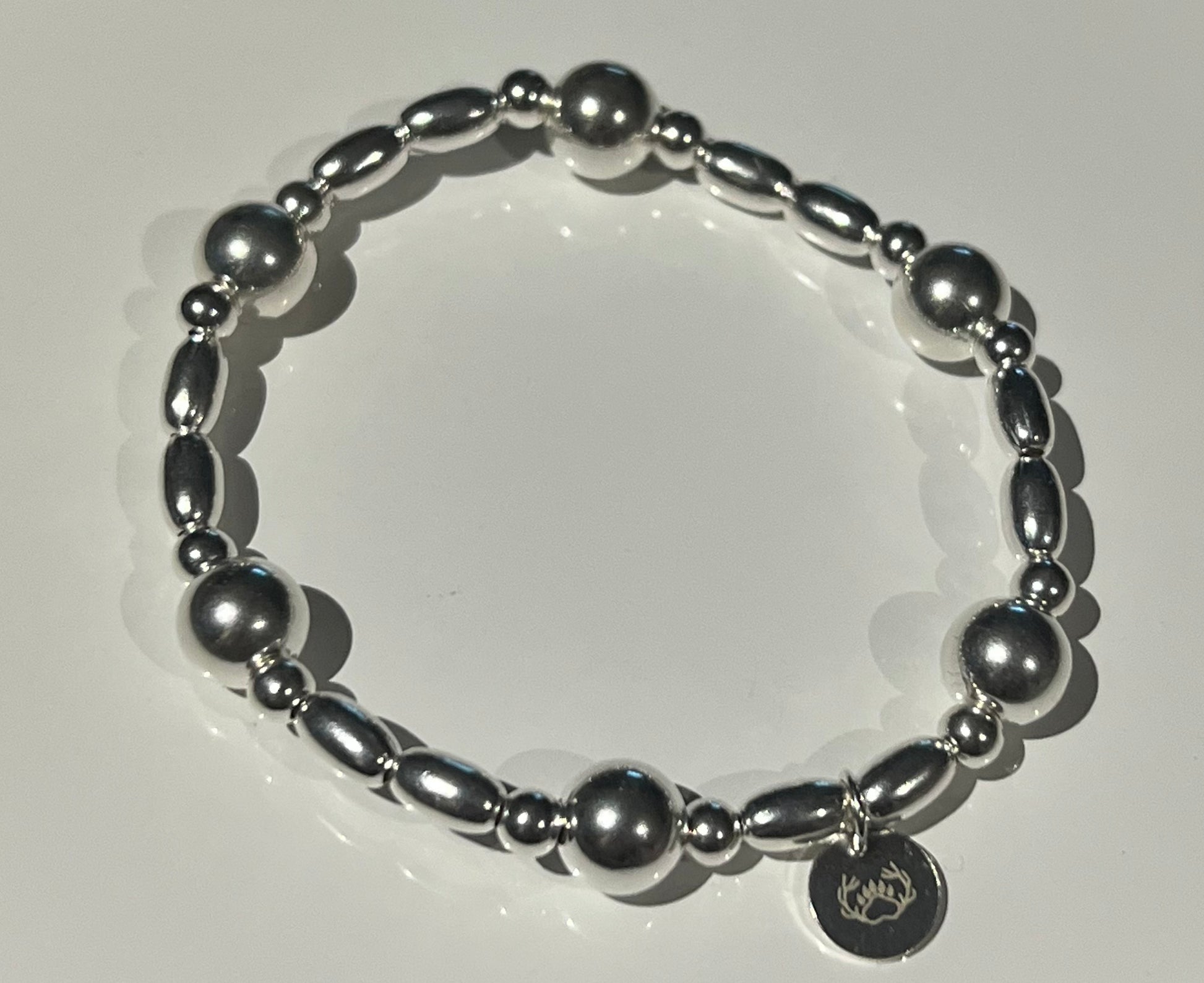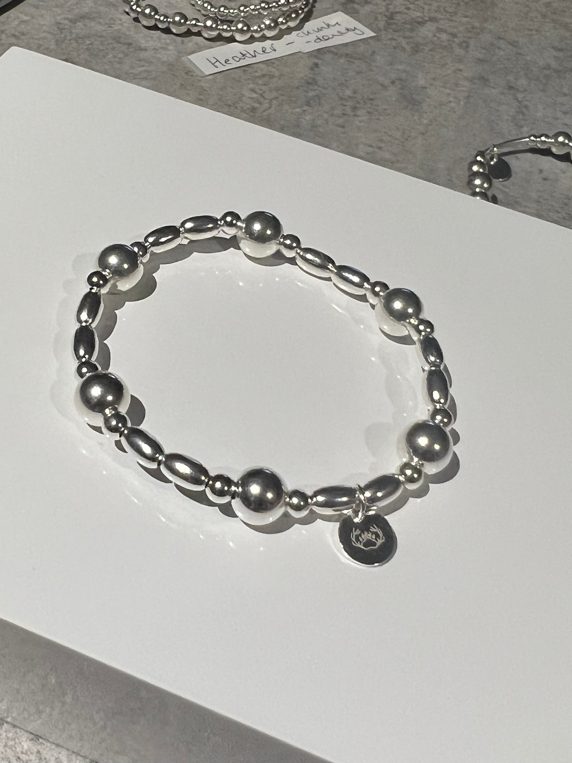 This bracelet is handmade using a variety of sterling silver beads which are strung onto elastic. This bracelet is lovely as a single piece or could be layered up with other bracelets to make more of a statement.