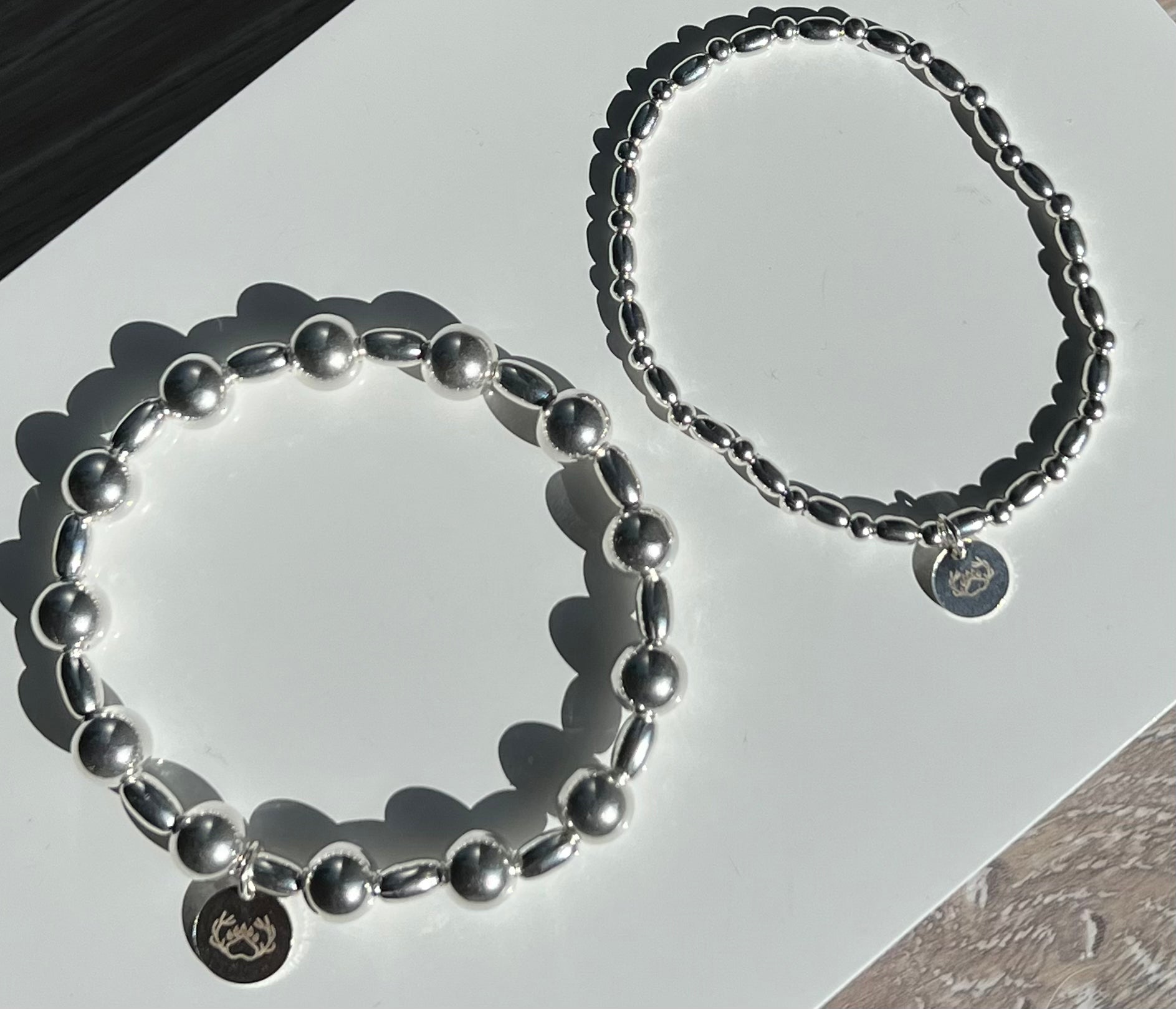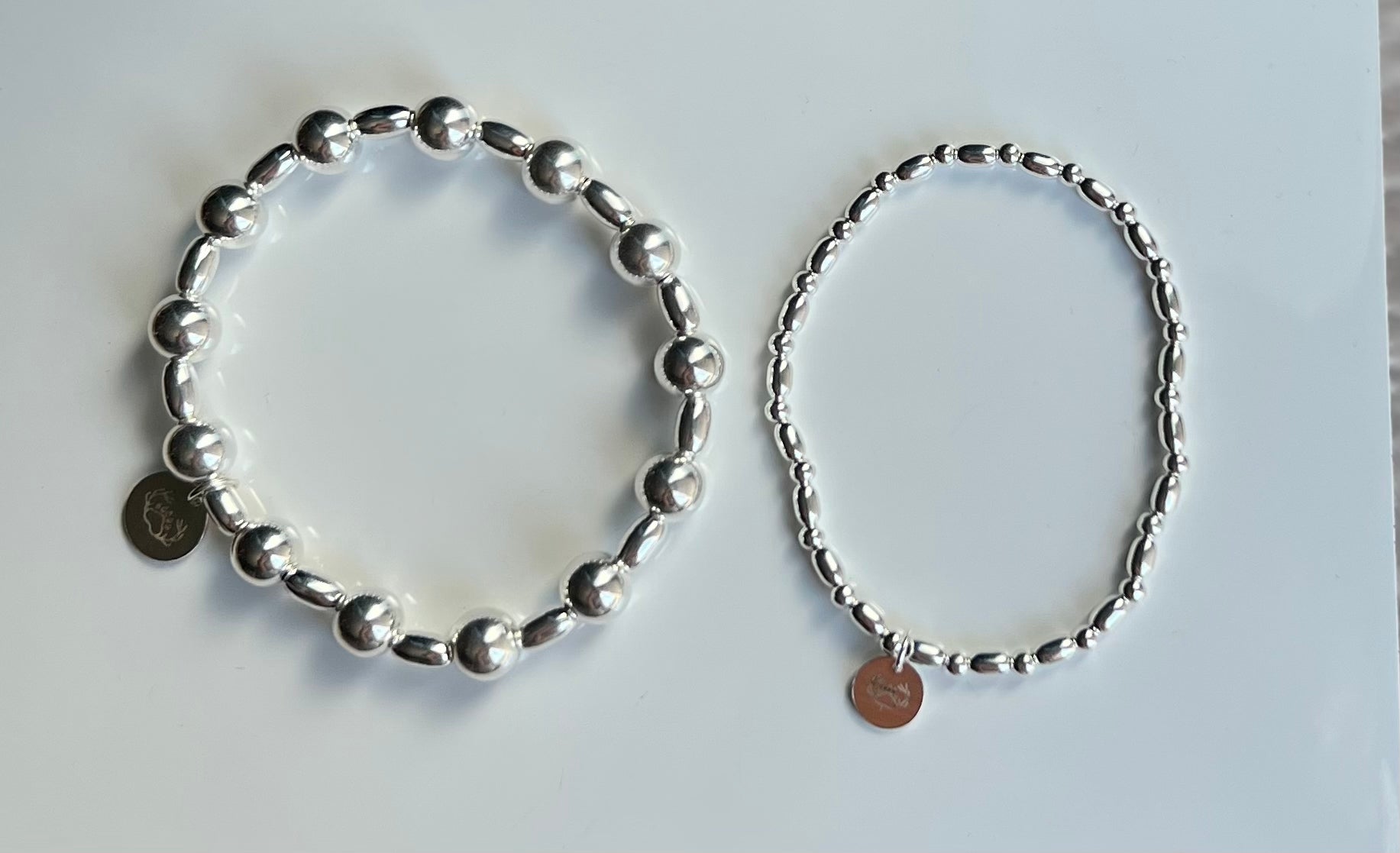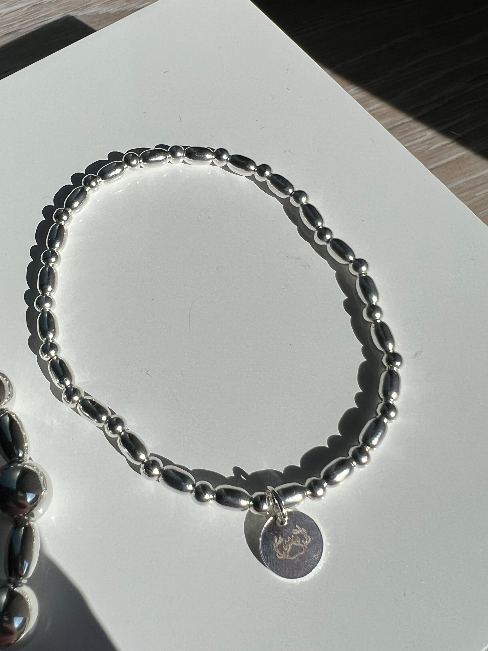 This bracelet is handmade using a variety of sterling silver beads which are strung onto elastic. This bracelet is lovely as a single piece or could be layered up with other bracelets to make more of a statement.